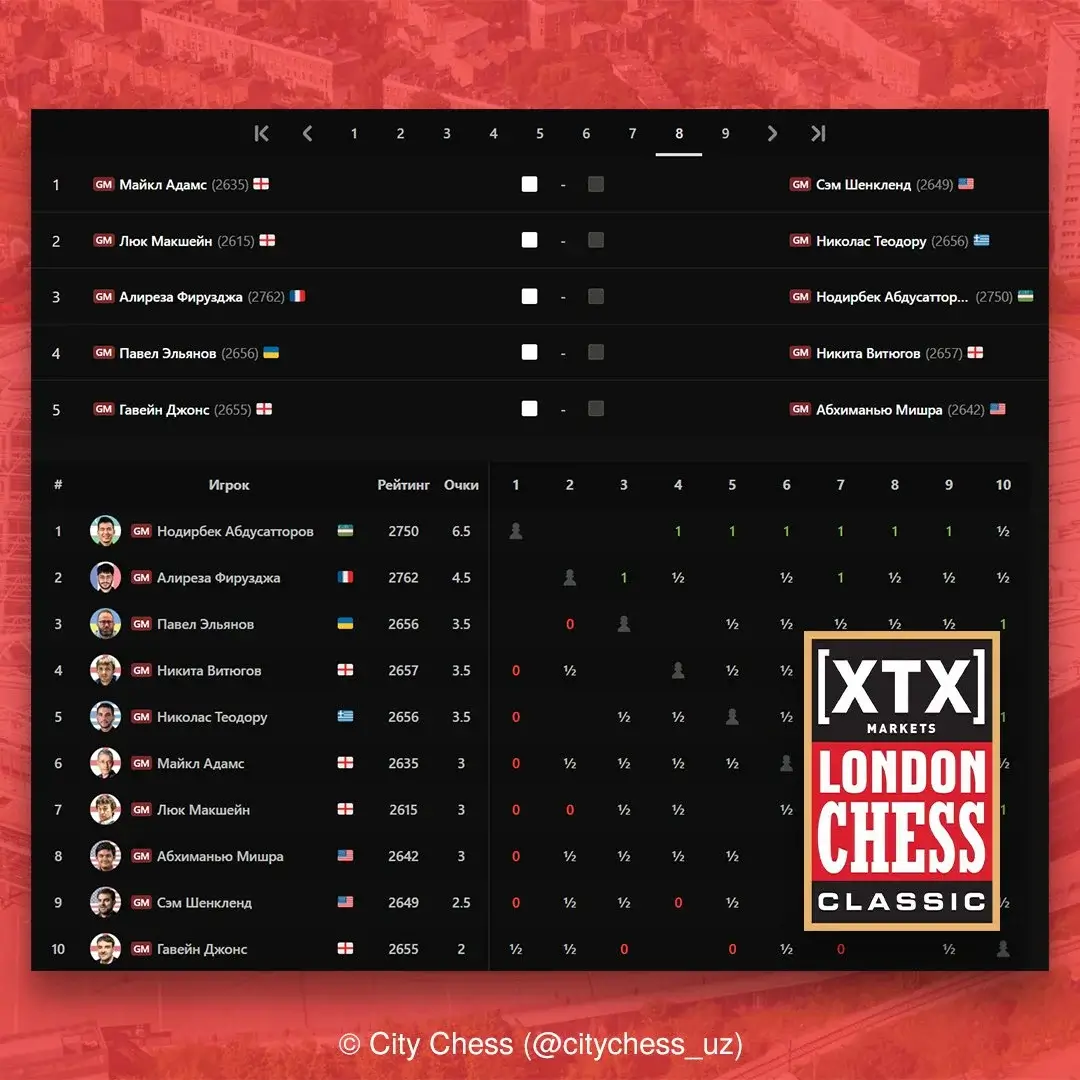 "London Chess Classic 2025" turnirida hamyurtimiz Nodirbek Abdusattorov o‘zining oltinchi g‘alabasini qo‘lga kiritdi. U 7-turda Lyuk Maksheynni mag‘lub etishni uddalagan va shu tariqa 6,5 ochko bilan turnir jadvalida yakka peshqadamga aylandi.