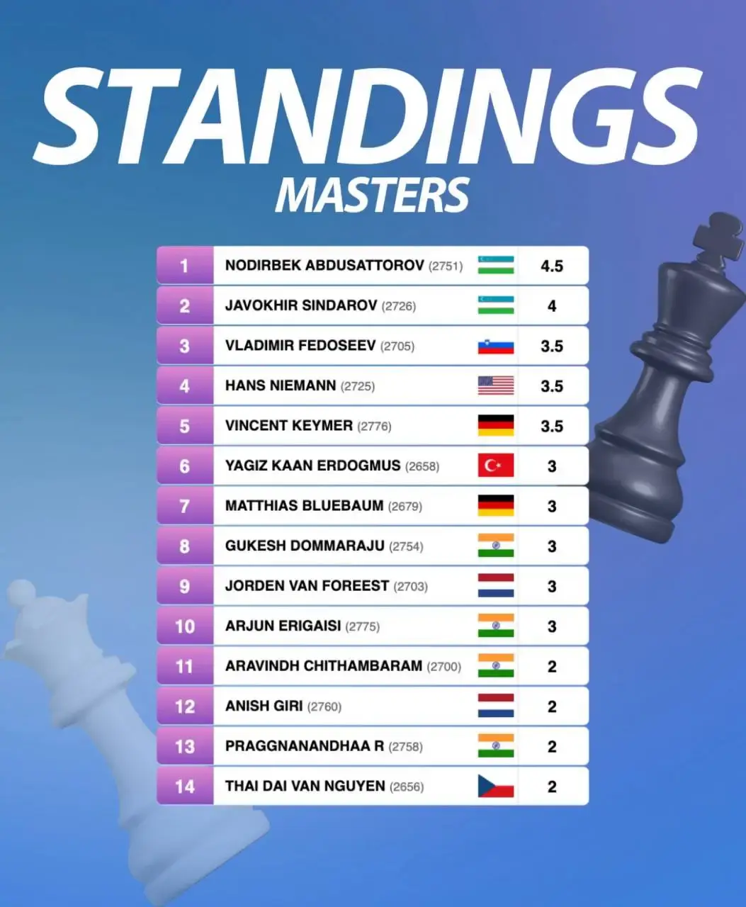6-turdan keyingi holatga ko‘ra, Masters guruhi turnir jadvalida Abdusattorov 4,5 ochko bilan 1-o‘rinni egallab turibdi. Sindarov esa 4 ochko jamg‘argan holda ikkinchi pog‘onada joylashgan. Qolgan raqiblar orasida Vladimir Fedoseev, Xans Nimann va Vinsent Keymer 3,5 ochkodan to‘plab, yetakchilarni quvib kelyapti.