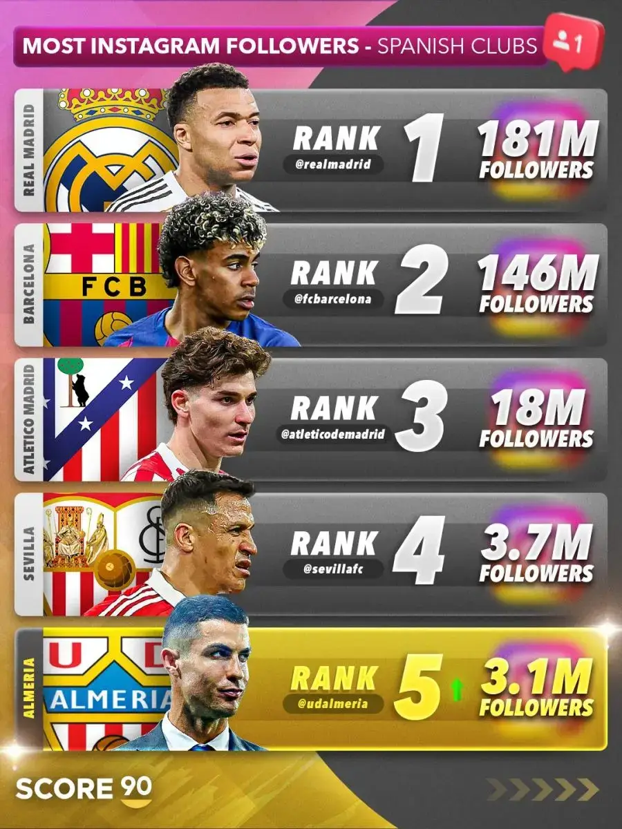 Ayni damda "Almeriya" o'zining ijtimoiy tarmoqlardagi auditoriyasi bilan 3,7 million obunachiga ega "Sevilya" klubini ortda qoldirish arafasida turibdi. Ispaniya futbolida esa Instagram tarmog'ida eng ko'p obunachiga ega klublar ro'yxatini "Real Madrid" boshqarib bormoqda. Madridliklarning 181 million, "Barselona"ning 146 million hamda "Atletiko"ning 18 million obunachisi mavjud.