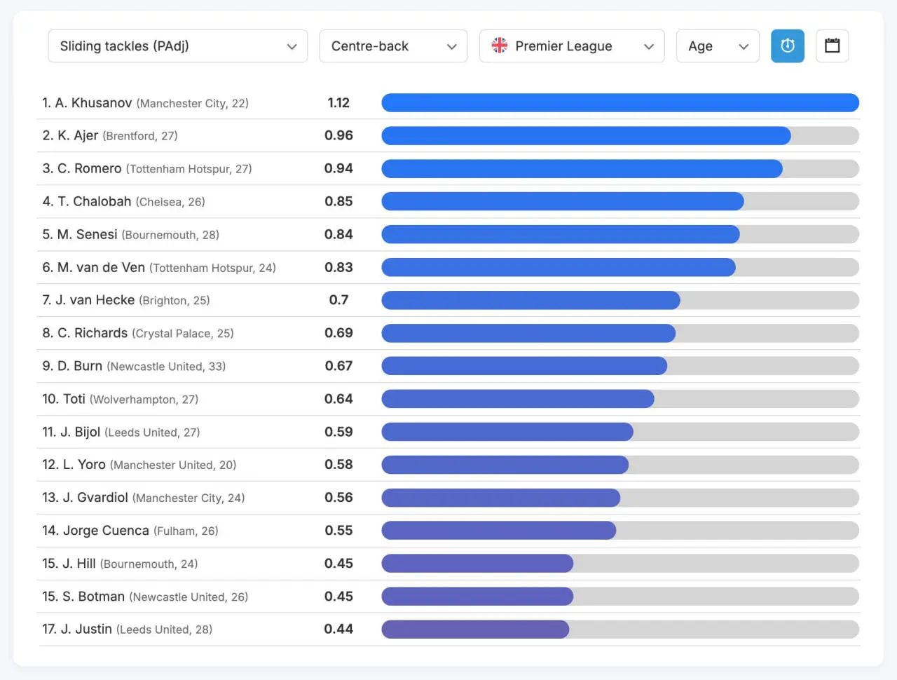 Reytingda ikkinchi pog‘onani Kristoffer Ayer (0.96) egallab turgan bo‘lsa, uchinchi o‘rinda Kristian Romero (0.94) joy olgan. Shuningdek, ro‘yxatda Trevo Chaloba, Markos Senesi va Mikki van de Ven kabi kuchli himoyachilar ham bor.