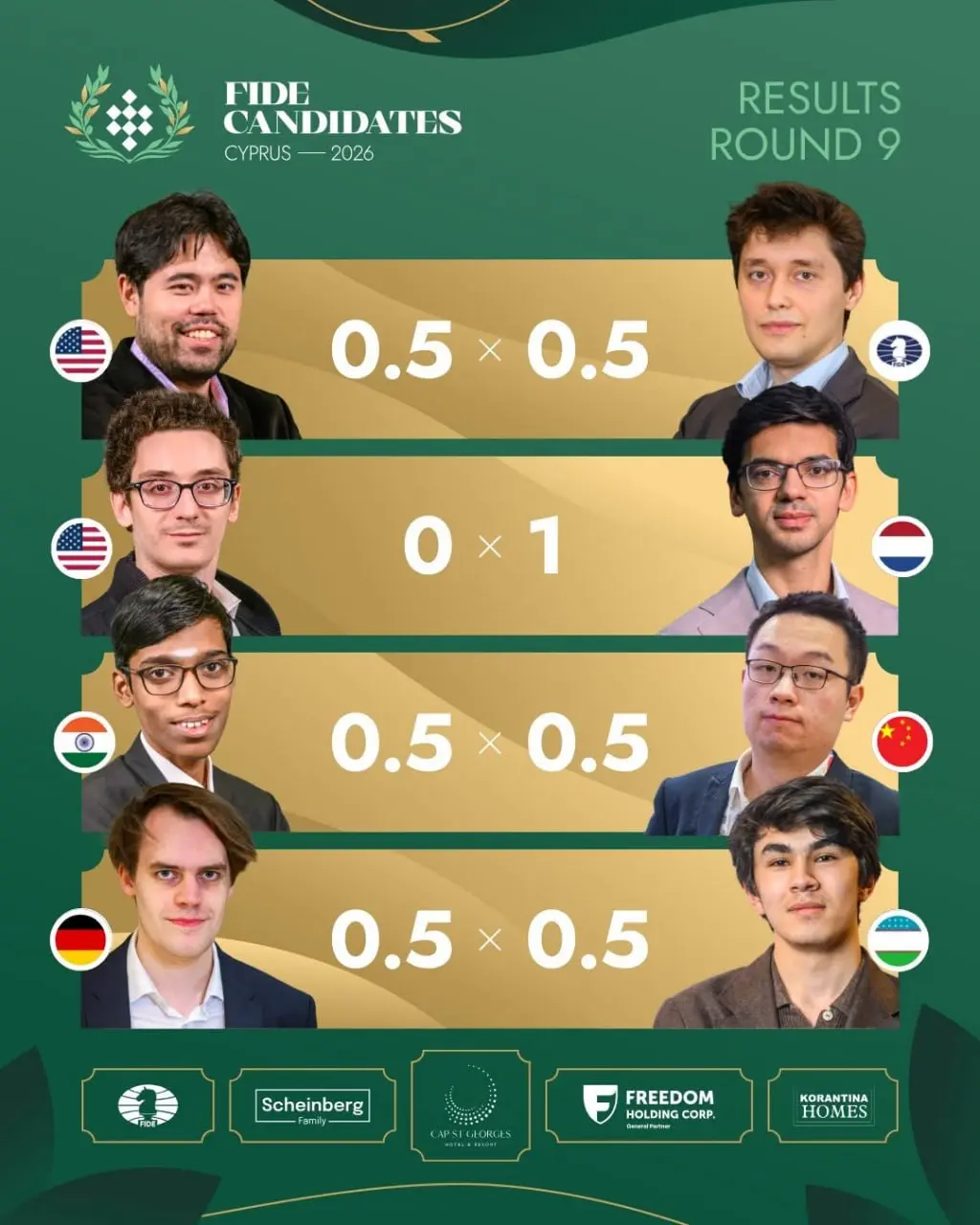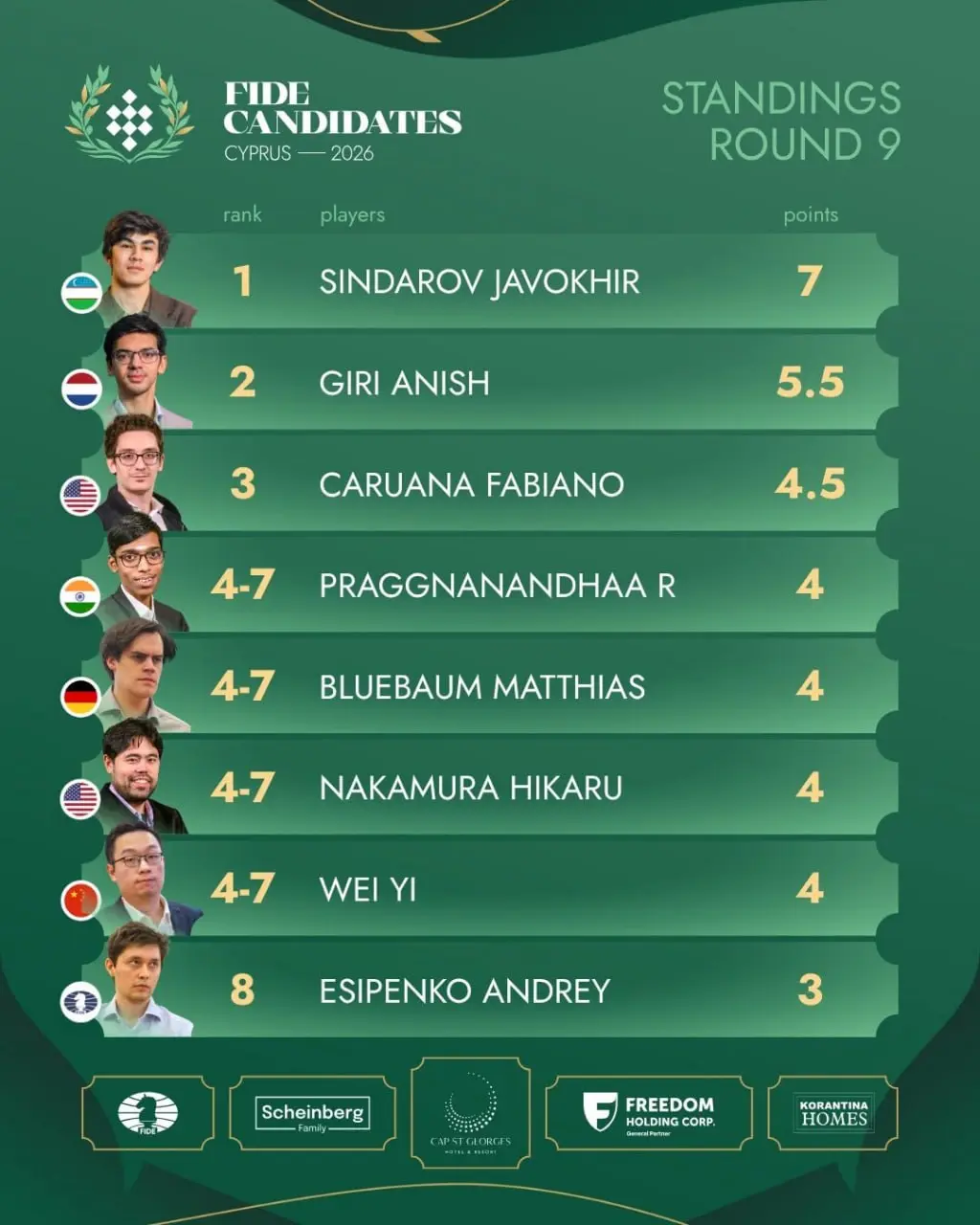 O‘zbekistonlik grossmeyster Javohir Sindorov 8 aprel kuni Nomzodlar turnirining 9-turida qora donalarda o‘ynab, Germaniyadan kelgan Mattias Blyubaum bilan durang qayd etdi.
