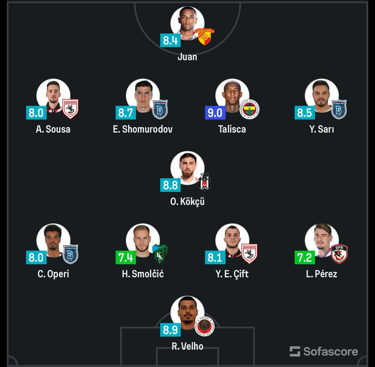 - Yarim himoyachilar: O. Ko‘kchu — 8.8, A. Sousa — 8.0, Taliska (“Fenerbaxche”) — 9.0, Y. Sari ("Istanbul Bashakshehir") — 8.5 ball.