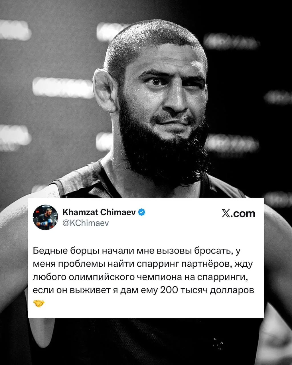Jang sportlari yulduzi Xamzat Chimayev istalgan Olimpiya chempioniga o‘zgacha va keskin taklif bilan chiqdi. Uning aytishicha, u bilan sparringga chiqqan har qanday chempion, agar mashg‘ulot jangidan “omon qolsa”, 200 ming dollar mukofot oladi.