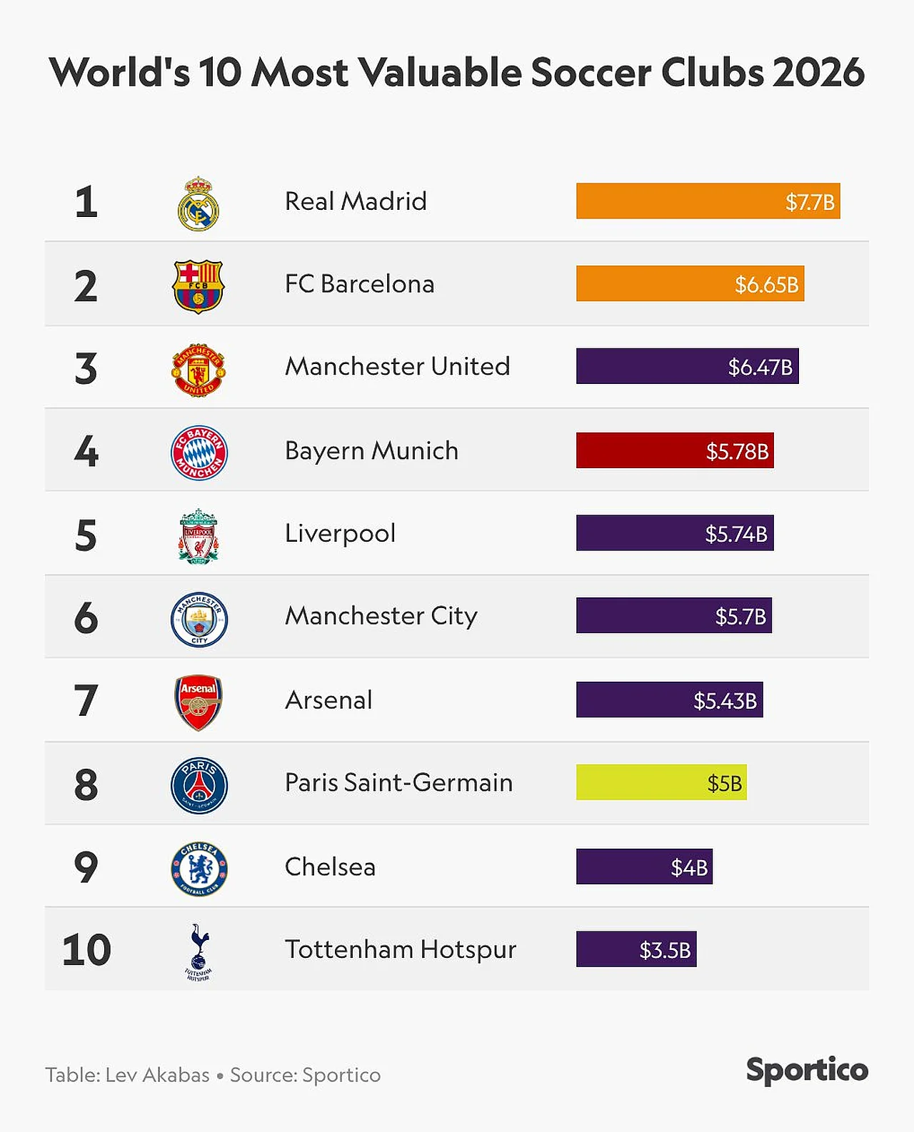 2026 yilgi prognozlarga ko'ra, dunyoning eng qimmat futbol klublari reytingini 7,7 milliard dollar qiymat bilan "Real Madrid" boshqarib bormoqda. Ikkinchi o'rinni 6,65 milliard dollar bilan "Barselona" egallagan bo'lsa, kuchli uchlikni Angliyaning "Manchester Yunayted" klubi (6,47 mlrd dollar) yakunlab bergan.