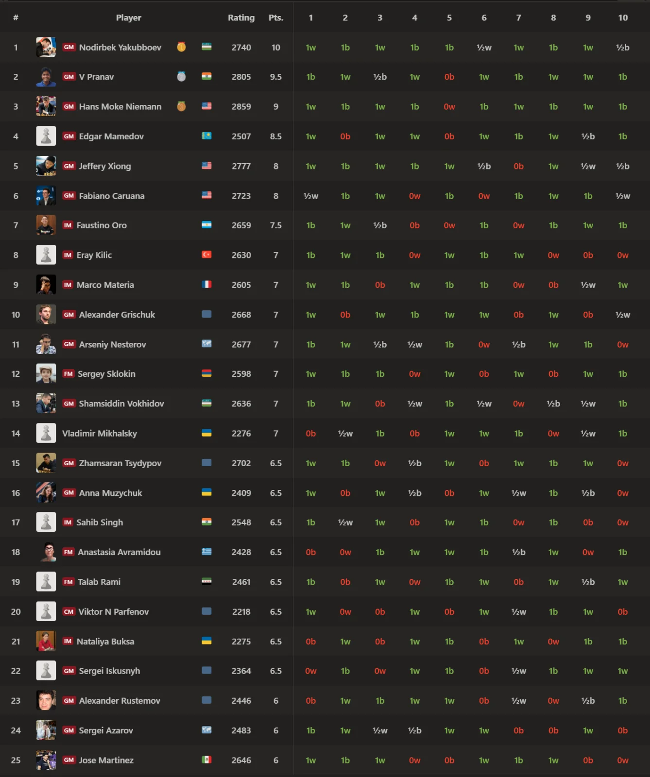 Ikkinchi oʻrinni hindistonlik V Pranaoʻ 9,5 ochko bilan egallagan boʻlsa, uchinchi pogʻonadan amerikalik Xans Nimann joy oldi (9 ochko). Shuningdek, kuchli raqobatchilar qatorida Fabiano Karuana kabi taniqli grossmeysterlar ham ishtirok etgani turnir nufuzini yanada oshirdi.