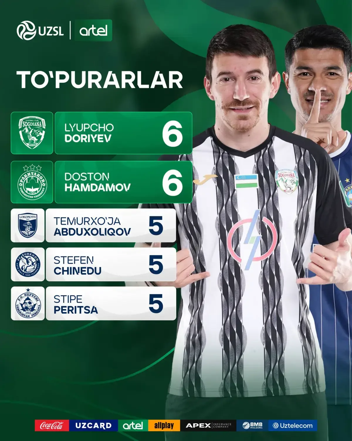 O‘zpfl maʼlumotiga koʻra, "Soʻgʻdiyona" hujumchisi Lyupcho Doriyev hamda "Paxtakor" vakili Doston Hamdamov 6 tadan gol urib, eng yaxshi merganlar roʻyxatida yetakchilik qilmoqda.