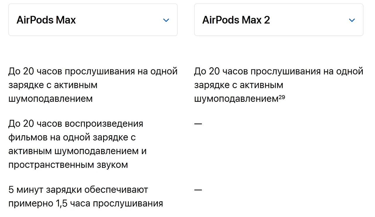 Batareya ishlash muddati o'zgarmagan. AirPods Max 2 faol shovqinni bekor qilish yoqilgan holda hamon 20 soatgacha tinglash vaqtini taqdim etadi. Shu bilan birga, Apple sayti yangi modelda avval mavjud bo'lgan tez quvvatlash funksiyasi endi bo'lmasligi mumkinligini ko'rsatmoqda.