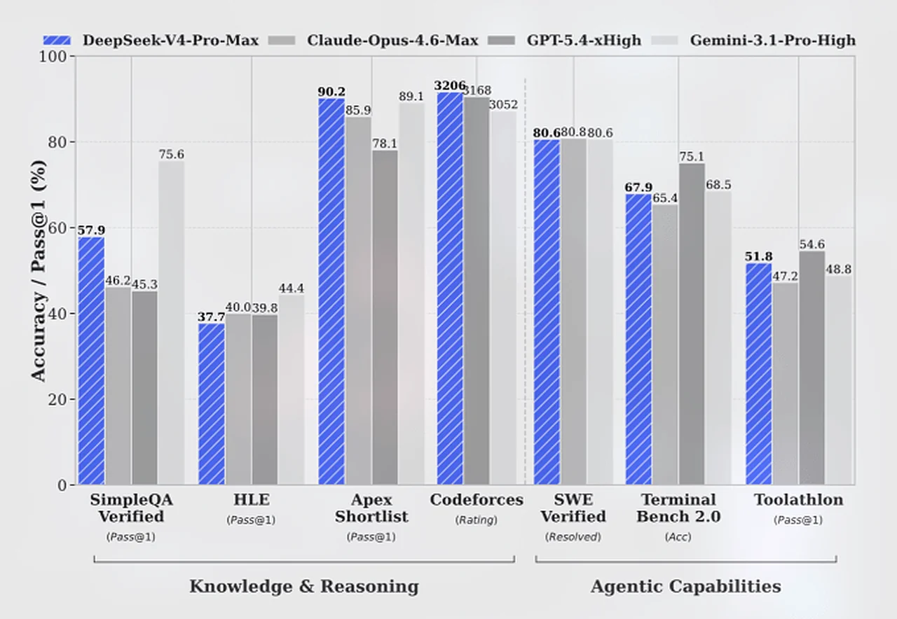 DeepSeek ma'lumotlariga ko'ra, V4-Pro-Max modeli mantiqiy topshiriqlarda OpenAI kompaniyasining GPT-5.2 va Google'ning Gemini 3.0 Pro tizimlaridan ustun kelmoqda. Dasturlash bo'yicha musobaqalarda esa har ikki yangi model GPT-5.4 bilan teng natija ko'rsatgan. Biroq, bilim darajasini tekshiruvchi testlarda Xitoy modellari hali ham AQShning eng ilg'or tizimlaridan 3 oydan 6 oygacha ortda qolayotgani qayd etildi.