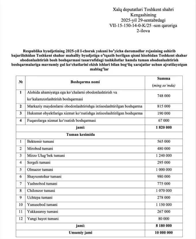 Тошкент шаҳри кенгаши 29 сентябрь куни шаҳар ободонлаштириш бош бошқармаси ва туман ободонлаштириш бошқармаларига мавсумий гулларни экиш ва ободонлаштириш ишлари учун 10 миллиард сўм маблағ ажратишни маъқуллади.