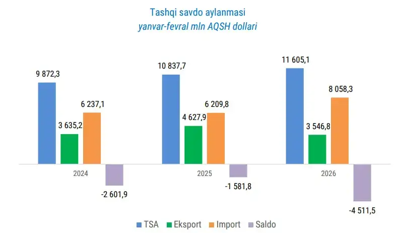 2026 йилнинг январь-февраль ойларида Ўзбекистоннинг ташқи савдо айланмаси 11,6 миллиард долларни ташкил этди. Бу кўрсаткич 2025 йилнинг шу даврига нисбатан 767 миллион долларга ёки 7,1 фоизга кўп бўлиб, мамлакатнинг халқаро савдо фаолиятида сезиларли ўсишни кўрсатмоқда.